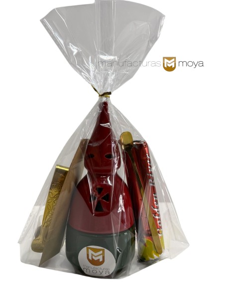 Maravilloso kit completo de incienso compuesto por: Incensario esmaltado (tú eliges color de capirote y color de base), tubo de diez pastillas de carbón de 33mm, mechero lanzallamas, bolsa de incienso de de la casa de 35 gr (Tres Reyes), cucharilla esmaltada y pinza para las pastillas de carbón.