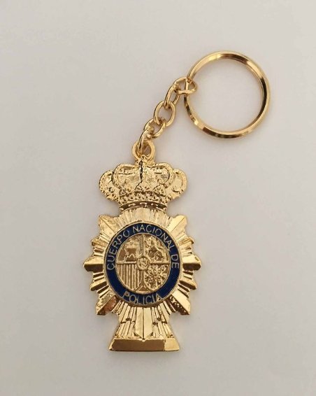 Lavero metal en una cara escudo Policía Nacional y en otra cara insignia Polícia nacional.