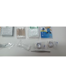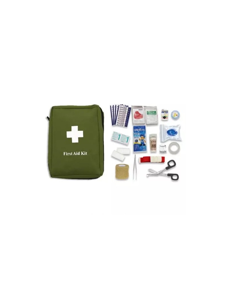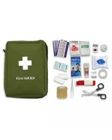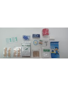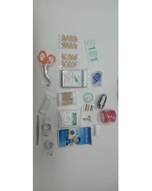Incluye tijeras, tiritas, vendaje triangular, venda de compresión elástica, venda, toallitas desinfectantes, bastoncillos, toallita comprimida, imperdibles, parche frío, manta térmica, pinzas, esparadrapo, kit de costura, torniquete elástico con bloqueo y una mascarilla RCP