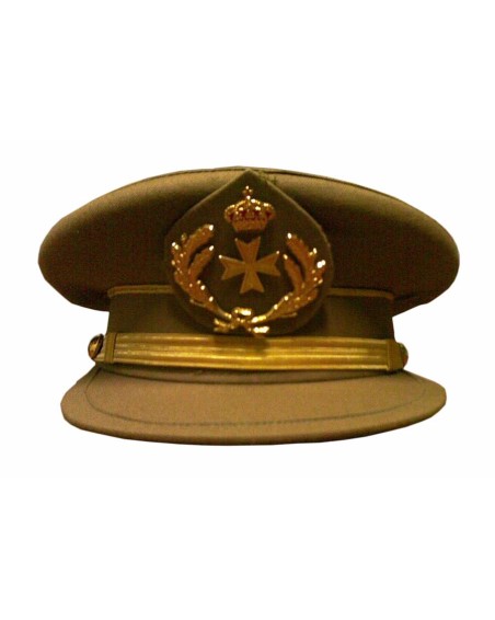 CONSUTLAR PRECIO. Gorra de plato de tela de sarga caqui, barboquejo dorado con botones dorados, cinta caqui, sutar en oro, galleta con escrudo metalico dorado, visera en tela de sarga caqui. Forro interior de raso con badana de piel.