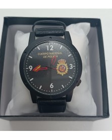 Elegante reloj de Policía Nacional con correa negra presentado en estuche.